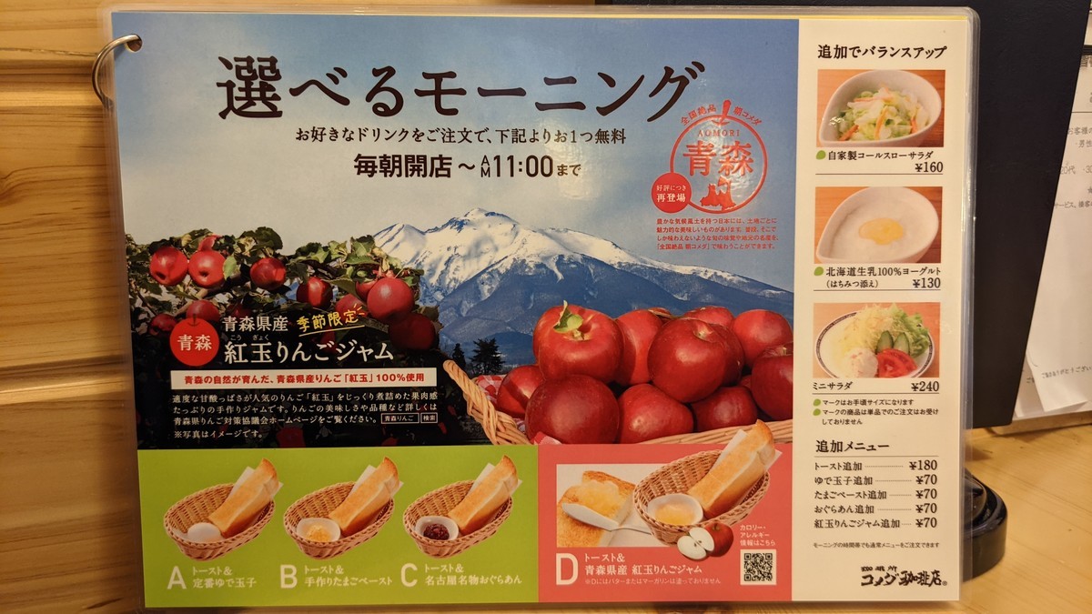 あとは食べ物……と言っても、現地ならではない上にチェーン店が最大の目的。コメダの地域限定モーニング「紅玉りんごジャム」は50店舗のみの実施で、近場でやっている店はなし。しかしながら今回の宿近くのコメダが実施店だったので行ってきました。